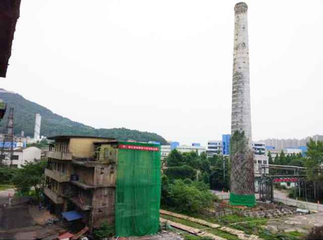 杭钢炼铁厂老一号高炉烟囱及值班室位于杭州市城区的杭钢炼铁厂厂区内。烟囱高60m,底部直径7m,距离G320国道约330m,距离最近的电机组仅1.8m;值班室高20m,南侧3m紧挨铁轨,距离待爆烟囱约38m,北侧距需保护设备仅8m,东侧距离高压线塔约70m,周边环境比较复杂。