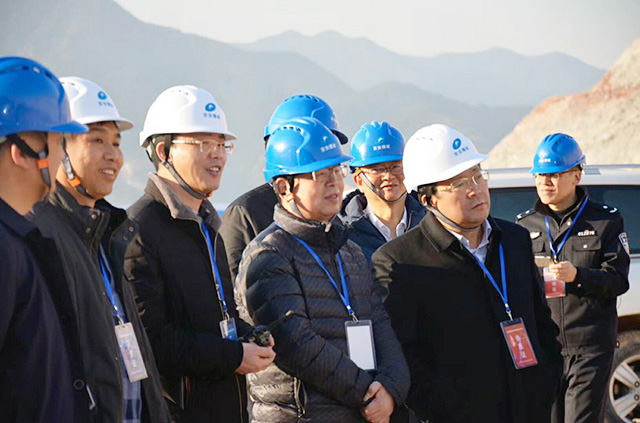 公安部三局马维亚副局长在公司总经理申屠建新(左三)、副董事长王霞明(左二)陪同下在安全区观看起爆过程。